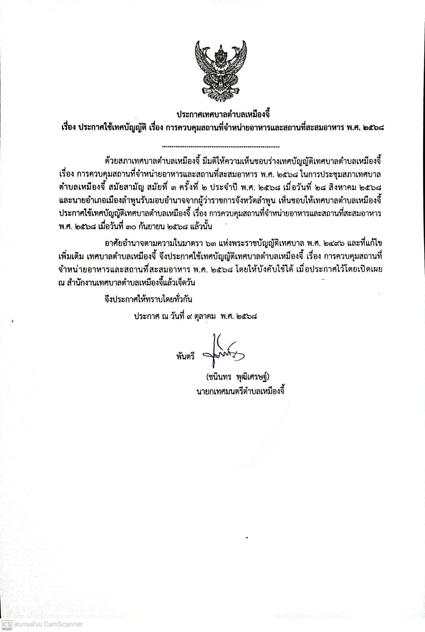เรื่อง ประกาศใช้เทศบัญญัติ เรื่อง การควบคุมสถานที่จำหน่ายอาหารและสถานที่สะสมอาหาร พ.ศ.2568