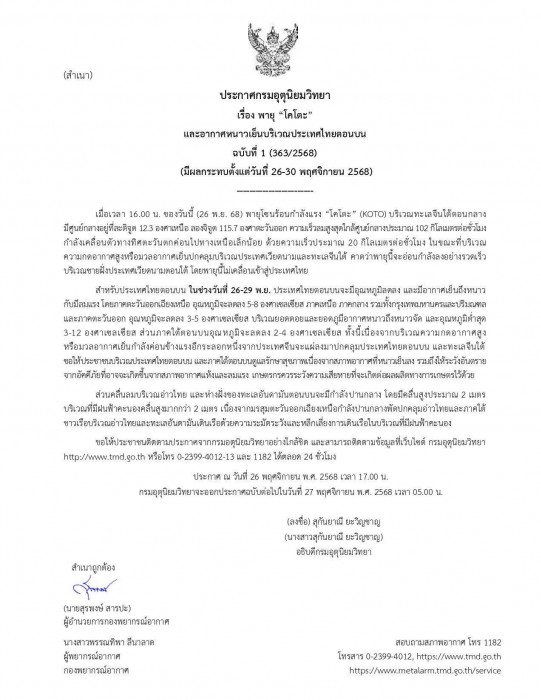 ประกาศกรมอุตุนิยมวิทยาเรื่อง พายุ “โคโตะ” และอากาศหนาวเย็นบริเวณประเทศไทยตอนบน ฉบับที่ 1 (363/2568) (มีผลกระทบตั้งแต่วันที่ 26-30 พฤศจิกายน 2568)