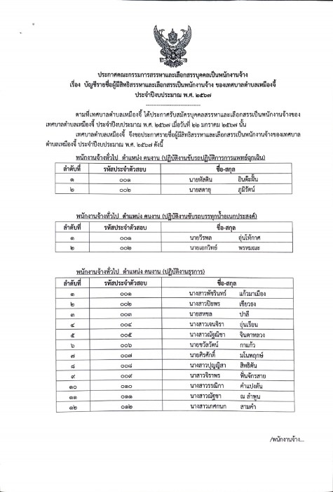 ประกาศรายชื่อผู้มีสิทธิสรรหาและเลือกสรรเป็นพนักงานจ้างของเทศบาลตำบลเหมืองจี้