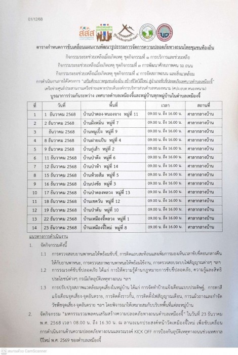 ตารางกำหนดการขับเคลื่อนแผนงานพัฒนารูปธรรมการจัดการความปลอดภัยทางถนนโดยชุมชนท้องถิ่น วันที่ 1-23 ธันวาคม 2568