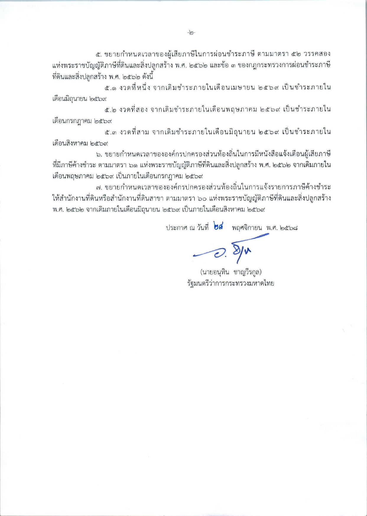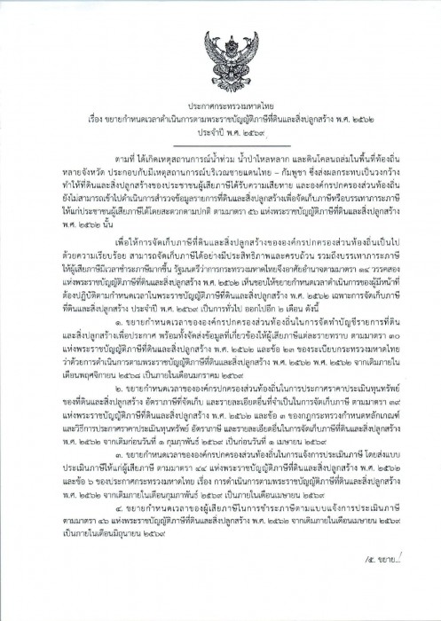 ประกาศกระทรวงมหาดไทย เรื่อง ขยายกำหนดเวลาดำเนินการตามพระราชบัญญัติภาษีที่ดินและสิ่งปลูกสร้าง พ.ศ. 2562 ประจำปี พ.ศ. 2569