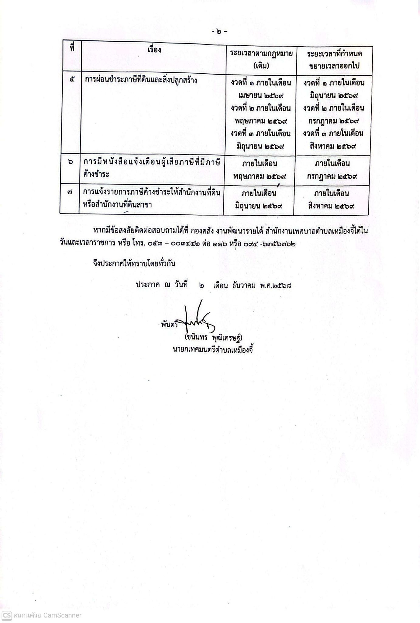 ประกาศเทศบาลตำบลเหมืองจี้ เรื่อง การขยายกำหนดเวลาดำเนินการตามพระราชบัญญัติภาษีที่ดินและสิ่งปลูกสร้าง พ.ศ. 2562 ประจำปี พ.ศ.2568