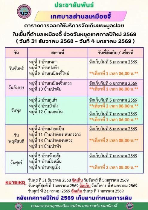 การเปลี่ยนแปลงวัน การออกให้บริการเก็บขนขยะมูลฝอย (ช่วงวันหยุดเทศกาลปีใหม่ พ.ศ.2569)
