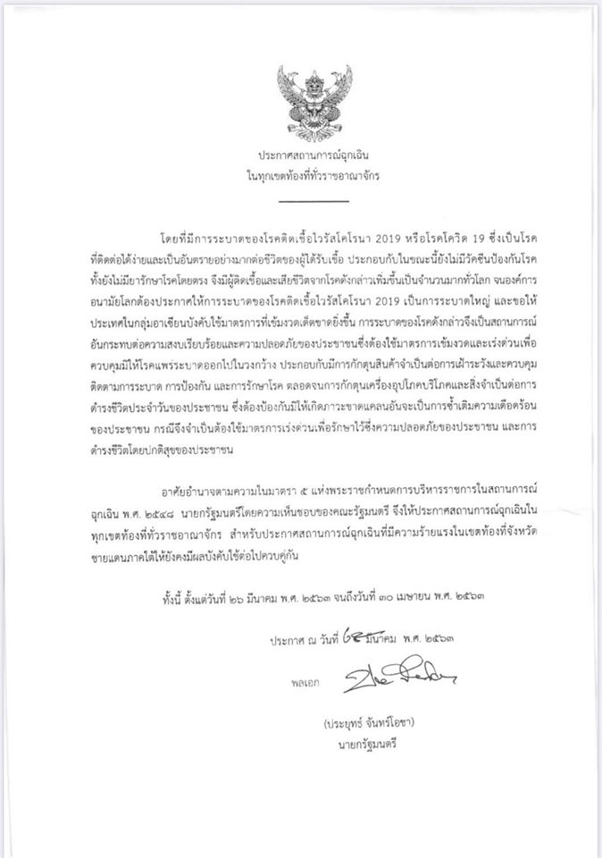 ประกาศสถาณการณ์ฉุกเฉินในทุกเขตท้องที่ทั่วราชอาทณาจักร